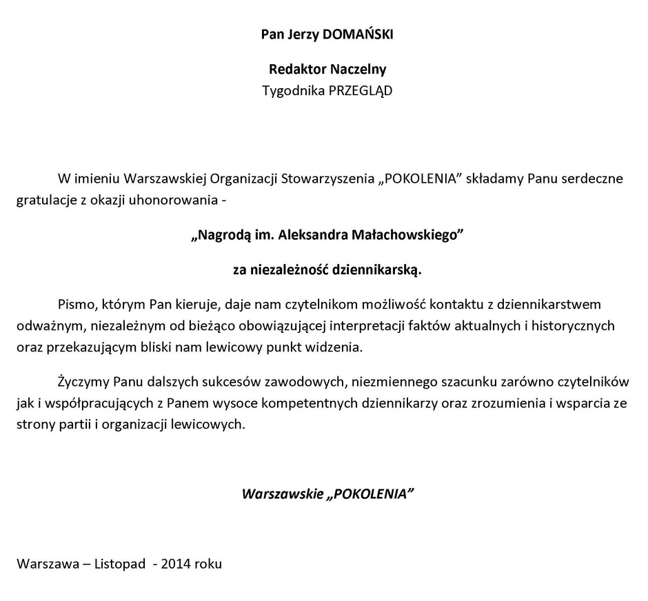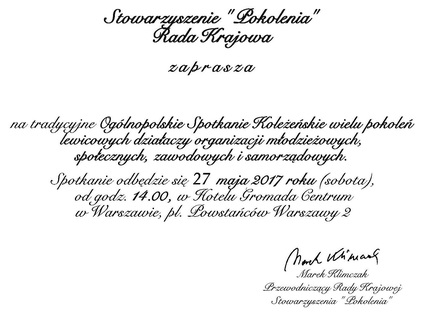 "... zachęcam członków i sympatyków Stowarzyszenia „Pokolenia” do wykorzystywania naszego doświadczenia w jednoczeniu się lewicowych działaczy i sympatyków organizacji młodzieżowych, społecznych, zawodowych i samorządowych. Nasza aktywność pomoże ugruntować p o d m i o t o w ą r o l ę „Pokoleń”, co również umocni pozycję Lewicy na scenie politycznej. (...)"