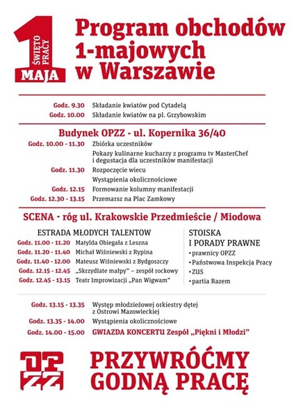5/ formowanie pochodu i przemarsz nastąpi zaraz po wystąpieniach przedstawicieli Lewicy, OPZZ i zaproszonych gości. Maszerujemy ulicą: Świętokrzyską po siedzibę OPZZ przy ul. Kopernika 36/40 gdzie kończymy oficjalne obchody i rozpoczynamy część rekreacyjną. Formowanie pochodu rozpocznie się o godzinie 11.30, a przemarsz o godzinie 12.00 zakończony ok. godziny 13.00 pod budynkiem OPZZ.
